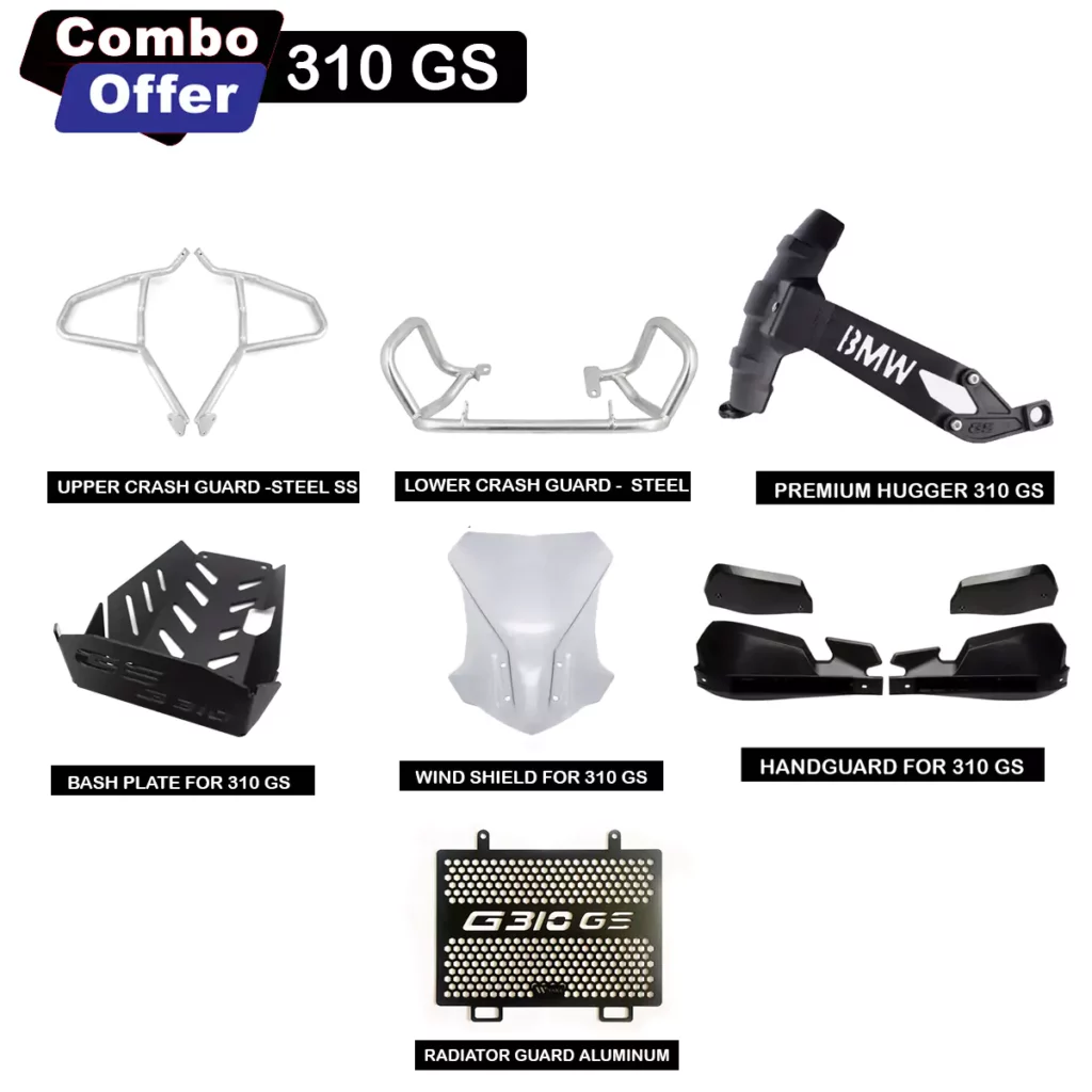 DescriptionBMW G310GS Combo-Black Upper Crash Guard Stainless Steel Black Lower Crash Guard Stainless Steel Tyre Hugger Bashplate Windshield handguard Radiator Guard