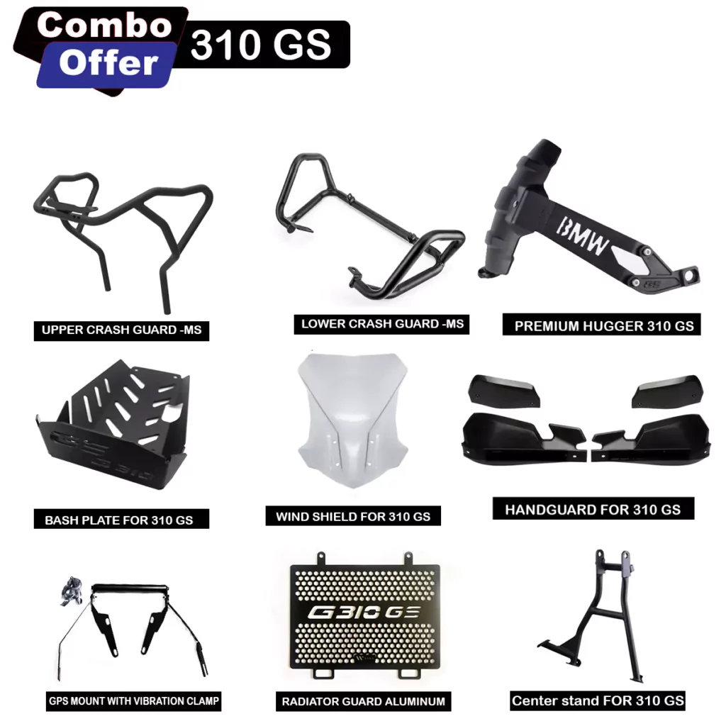 BMW G310GS MS Combo-Black Upper Crash Guard+Black Lower Crash Guard+Tyre Hugger+Bashplate+Windshield+handguard+Radiator Guard+Center Stand