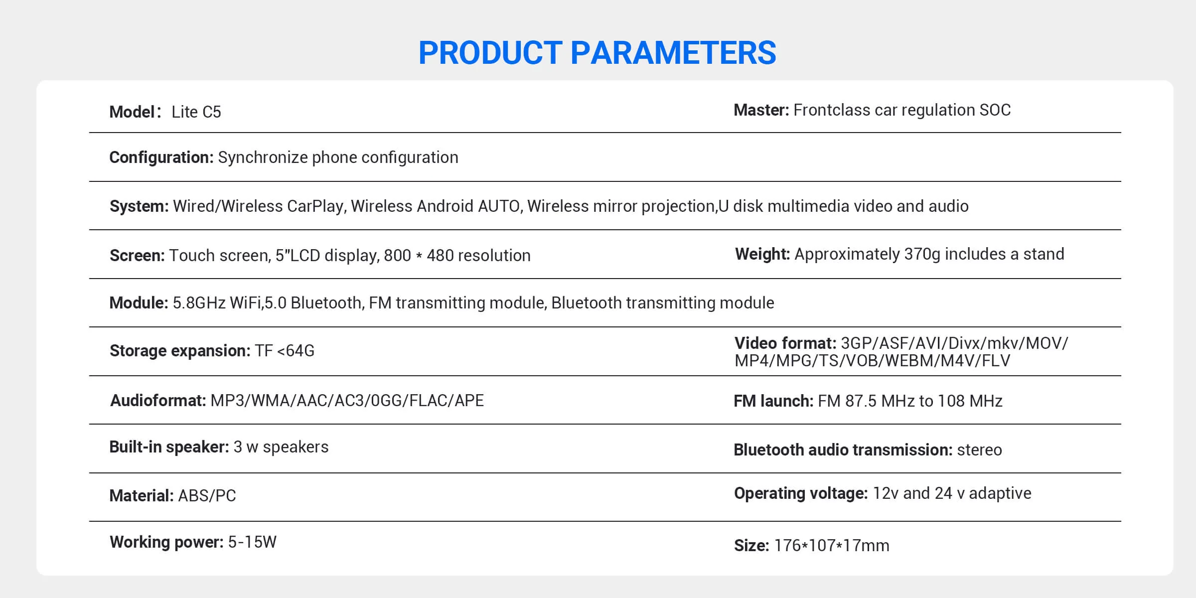.Processor: 4 Core 64 bit Cortex A53Screen size: 5 inch high definitionResolution: 800*480 wide