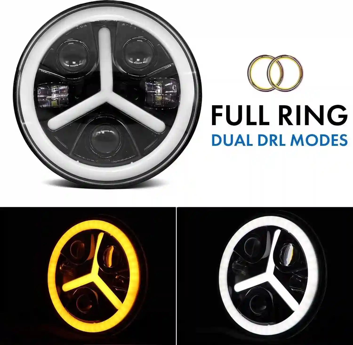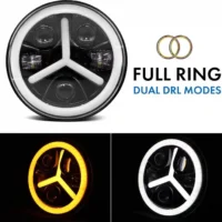 Mercedes design Full Ring Round White LED Headlight with Hi/Low Beam White & Yellow Angel Eye Lamp Compatible with Bullet, Harley Davidson Jeep Wrangler (75W, Pack of 1)7 Inch