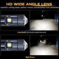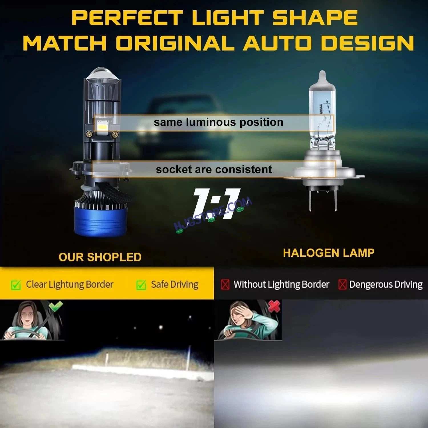 | Description | HJG Projector Lens H4 LED Bulb 45W HJG Y6 Projector Light Lamp H4 LED Mini Projector Lens with Fan for Bike Bulb 7000LM Conversion Kit Hi/Lo Beam Headlight 12V/24V for Motorcycle, Set of 1, White HJG H4 Dual Y6 Condenser RTD Lens Dual Projector Lens Projector Lens LED Headlight Bulb for car | Hi/Lo Beam Headlight 12V-80V | 100W | 5000LM | 3 Pin Projector h4 Headlight with Fan | (Pack of 2) 1,H4 Bi-LED Mini Projector Lens Headlight Bulbs 2, LHD, Left Hand Drive, RHD Right Hand Drive Optional 3, Voltage: DC 9V-16V 4, Color Temperature: 6000K White 5, Power: 50W/piece, 100W/pair 6, Lamp model size: H4 7, Lumen: 12000LM 8, Install Method: Plug-and-play LED Headlight 9, Beam Type: Hi-Lo Beam 10, Lifespan: >30000 hours 11, Operating Temperature: -40?C ~ +80?C 12, Material: Aviation Aluminum, PC Lens 13, Suitable cars: Universal car. Also can fit motorcycle 14, Waterproof Rate: IP65 Product Features: 1, Upgrade Mini Size. Super Mini. Smaller than the old type. 2, Built-in, Mini Projector Lens, Crystal clear, more Concentrated light output. 3, Hi-Lo beam, Low beam clear cut-off line, will not dazzle on coming vehicle, Rectangle high beam take light to a great distance. 4, Connect wire cable, High temperature and waterproof, fast conduction, high power, steady current. 5, Plug and Play, easy to install. 6, Aviation aluminum body and built-in Fan, fast heat dissipation. 7, Decoding Function Constant current and temperature protect. Products include: 2pcs H4 lights for Left hand drive (The steering wheel is on the left and the car is driving on the right side of the road.)