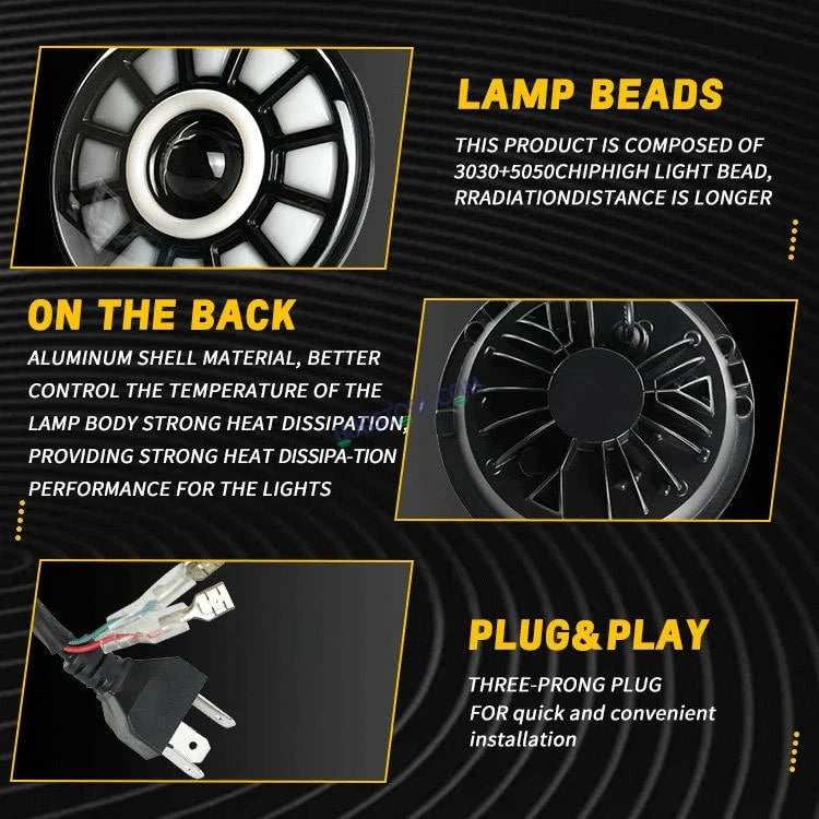 Installation position: Center. Light bulb included. Housing color: Black. High beam, low beam. High beam, low beam, installation position: Center, light bulb included, led light. | Buy Original HJG LIU HJG LED Headlight, HJG Foglight, HJG Fog light, HJG Bike, HJG Car Accessories Online India at HJGstore.com!?Official HJG Store India?Buy HJG LED Headlight, Bulbs, Foglight, Fog light, LIU HJG India at HJGstore.com HJG 7 Inch Angel Wings White LED Headlight Angel Wings Headlight Assembly for Thar Royal Enfield | 75-120W CREE/Osram LED Chip Multi color Compatible with Royal Enfield, Jeep, Thar, Gypsy HJG Royal Enfield Thar Headlight Assembly Royal Enfield Headlight Assembly & Mahindra Thar Headlight Assembly. This Headlight Assembly is compatible with All Royal Enfield Models & Mahindra Thar. Animated Headlight Assembly for Jeep Thar Royal Enfield HJG 7 Inch Headlight Assembly HJG 7 Inch LED Headlight Illuminate your adventure with the HJG 7 Inch LED Headlight. Designed to elevate the look and performance of your vehicle, this cutting-edge headlight packs a powerful punch with its 75-120W CREE/Osram LED te chnology. Experience unmatched brightness and clarity on the road. Key Features: Dazzling RGB Colors: Customize your ride?s appearance with a vibrant spectrum of colors. Superior Brightness: Powerful CREE/Osram LEDs deliver exceptional illumination for enhanced visibility. Versatile Compatibility: Perfect fit for Royal Enfield, Jeep, Thar, and Gypsy models. Durable Construction: Built to withstand tough conditions for long-lasting performance. Upgrade your vehicle?s style and functionality with the HJG 7 Inch RGB LED Headlight. Powerful Illumination: Delivers a blinding 75-120W brightness using high-performance CREE/Osram LEDs for superior visibility. RGB Color Customization: Express your style with a vibrant range of colors to match your vehicle?s personality. Wide Compatibility: Designed to fit seamlessly on Royal Enfield, Jeep, Thar, and Gypsy models for a hassle-free upgrade. Durable Construction: Built to withstand tough conditions with a robust design for long-lasting performance. Enhanced Visibility: Illuminate the road ahead with a wider light pattern for safer night driving. Energy Efficient: Consumes less power while delivering maximum brightness. Easy Installation: Simple plug-and-play design for quick setup. Modern Design: Sleek and stylish appearance to complement your vehicle?s aesthetics. Compatible for RE Bike, Thar, Gypsy, Mahindra, Jeep. Operating Voltage: 12V-80V, 75W - 120W