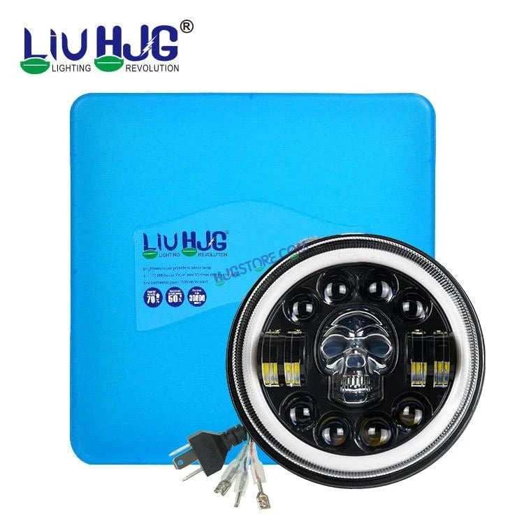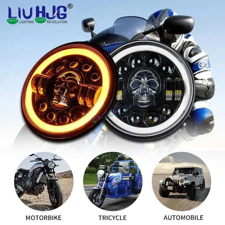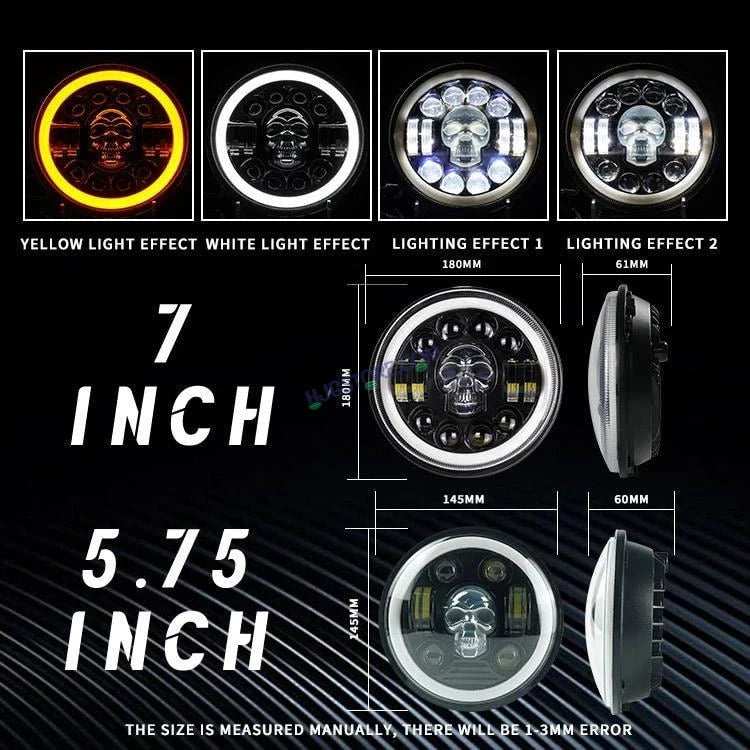 HJG 7 Inch Led Headlight Halo Lights Dual Color Yellow White 30w 7 Inch Round Motorcycle Lights For Jeeps Universal Car Compatible with Royal Enfield, Jeep & Harley Davidson (Harley Boss Headlight) Skull 2 HJG