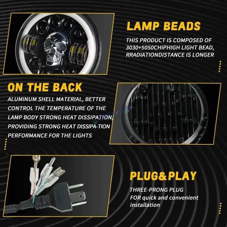 HJG 7 Inch Led Headlight Halo Lights Dual Color Yellow White 30w 7 Inch Round Motorcycle Lights For Jeeps Universal Car Compatible with Royal Enfield, Jeep & Harley Davidson (Harley Boss Headlight) Skull