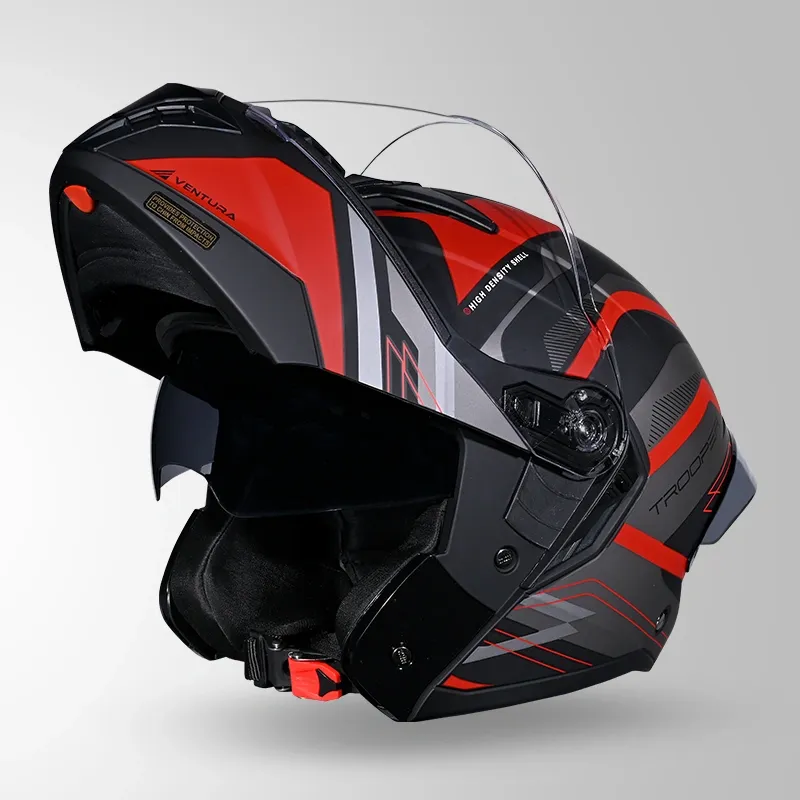 Discover the perfect blend of safety and style with the Trooper D3 Venture Decor. This innovative flip-up full-face helmet combines exceptional convenience with superior protection. Featuring a quick-release visor, ISI and DOT certifications, and a high-impact-resistant outer shell, it offers unmatched durability. The rust-proof stainless-steel buckle adds reliability, while the dynamic ventilation system ensures optimal airflow for a cool and comfortable ride. Ideal for riders who value top-notch safety, functionality, and design.
